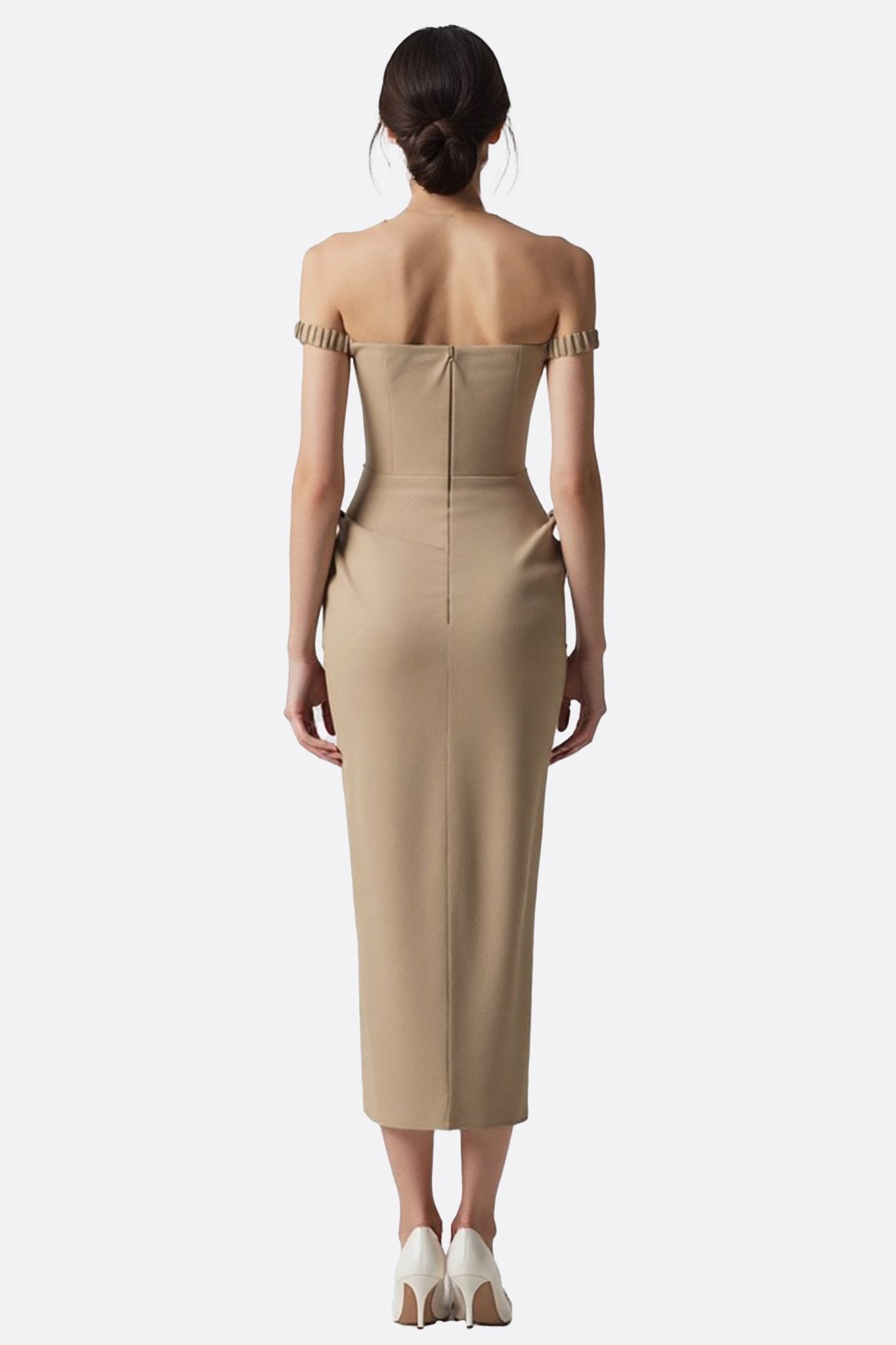 A refined silhouette with sculptural elegance, this beige crepe midi dress is the epitome of contemporary sophistication. Designed with architectural draping and couture-inspired details, it enhances every curve while offering timeless evening appeal.