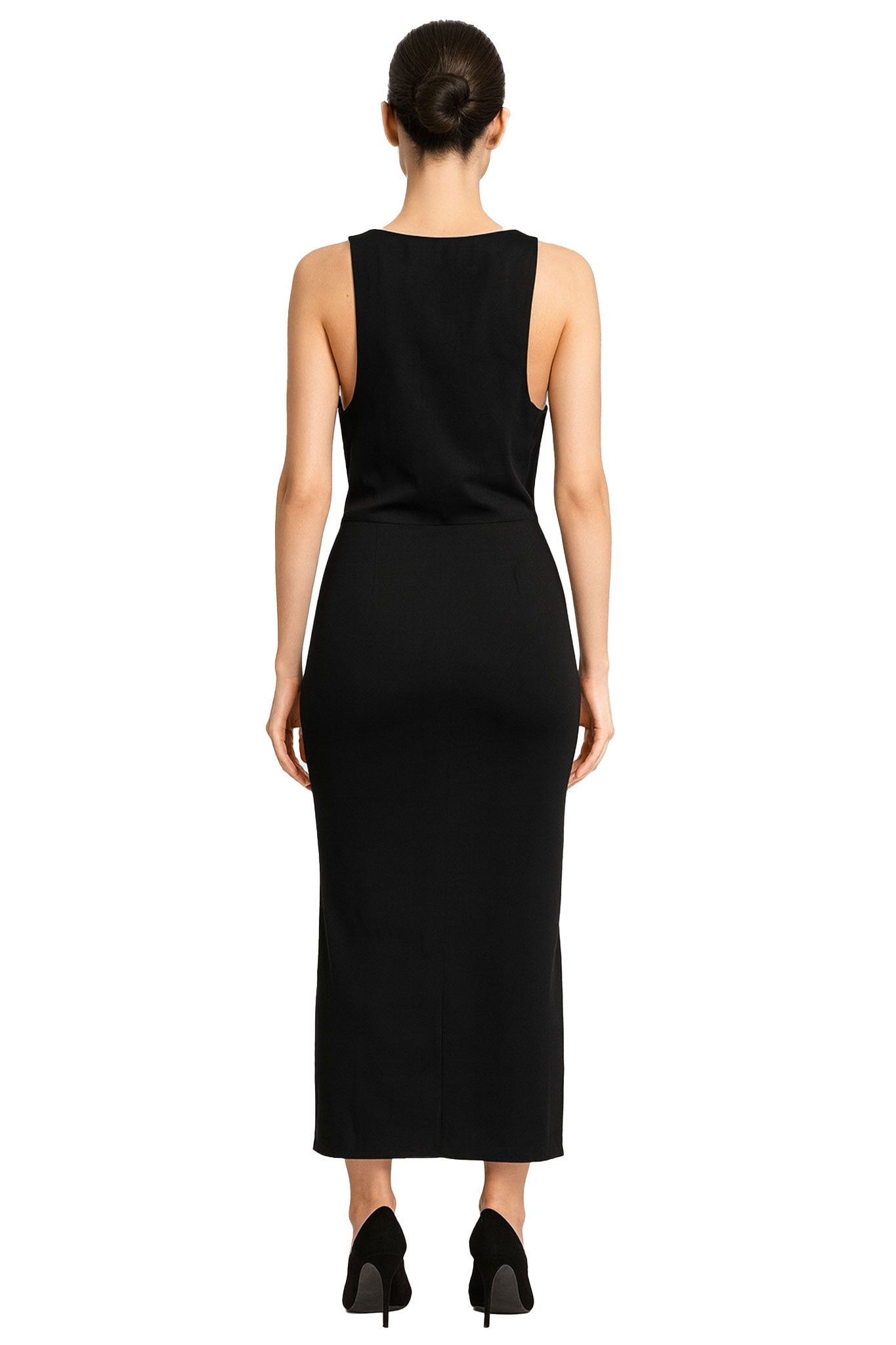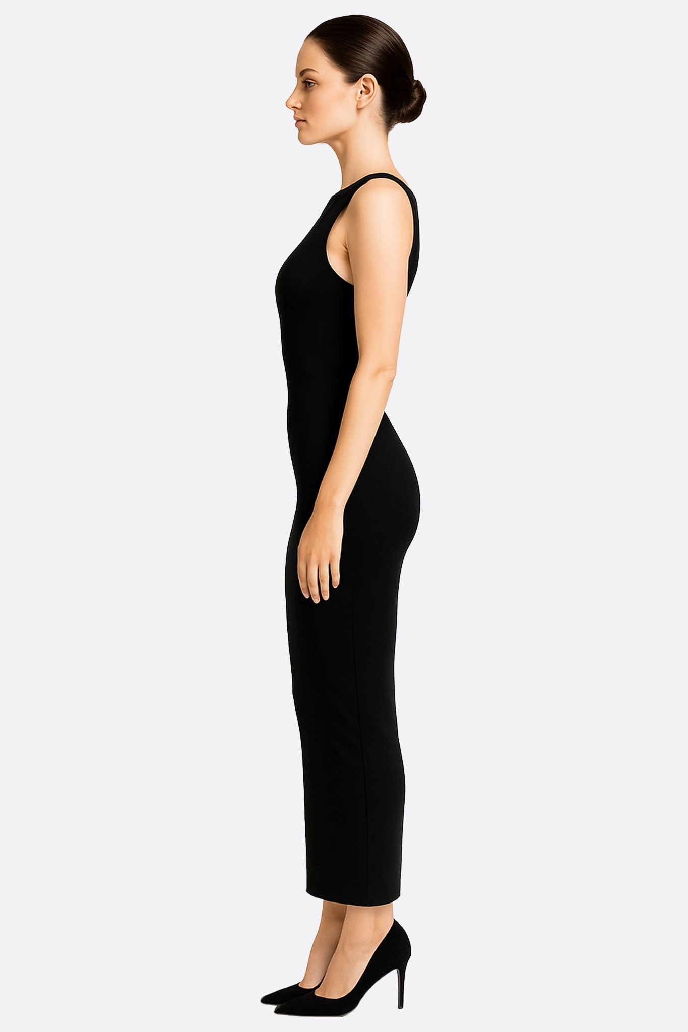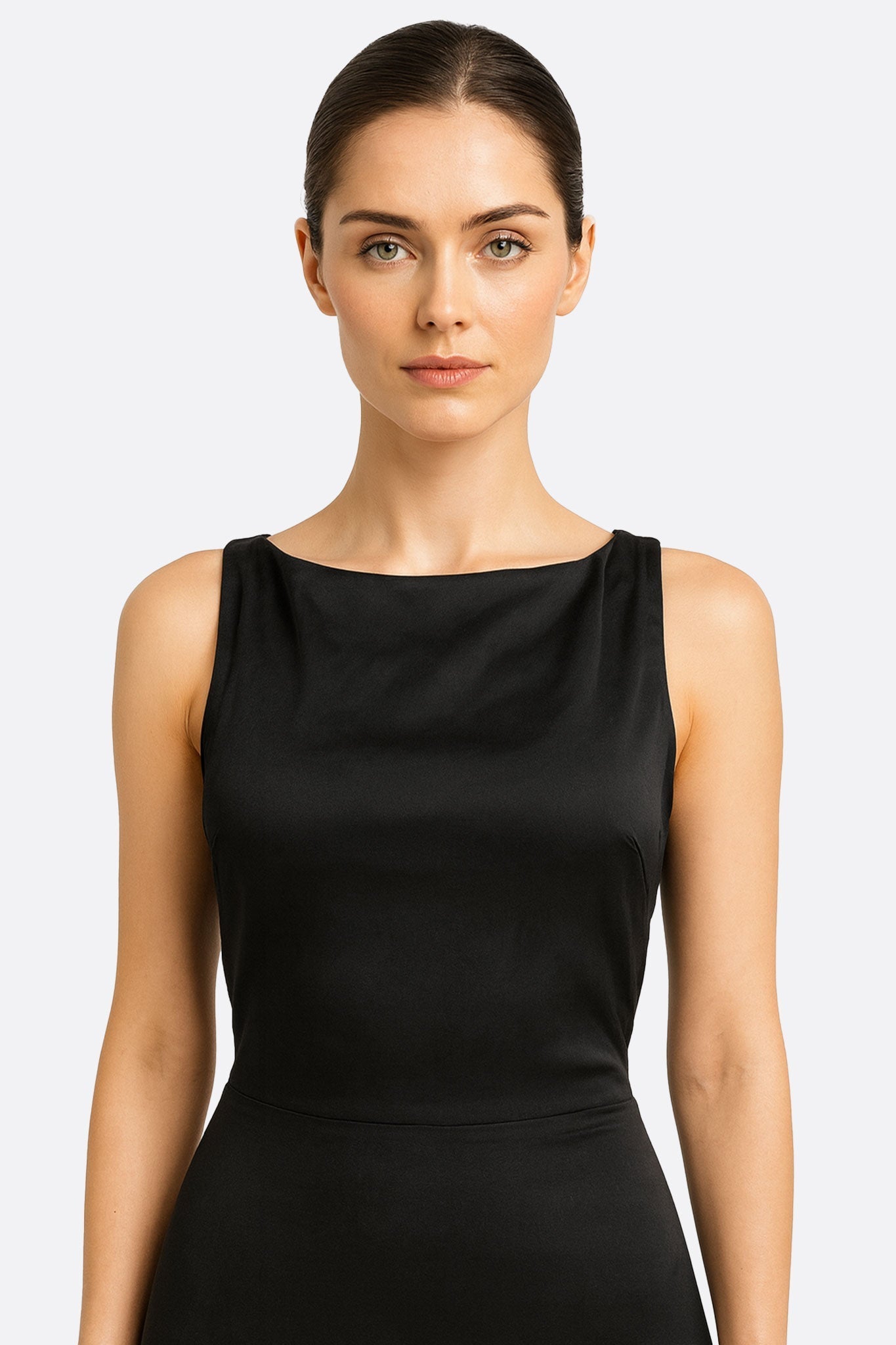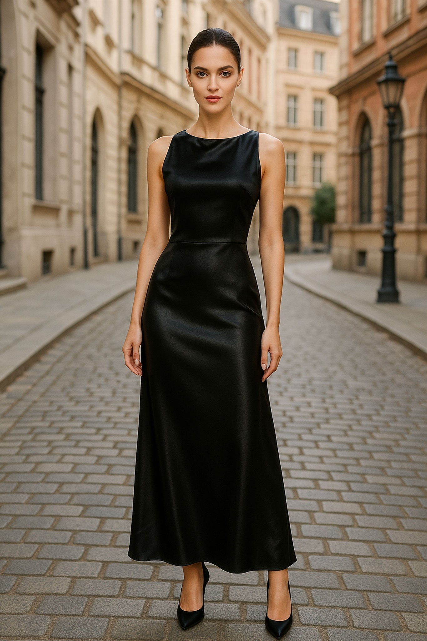 Sculpted in fluid black satin, this long evening dress embodies discreet sophistication and timeless grace. With its clean lines and subtle sheen, it highlights the silhouette naturally while capturing the light with refinement.