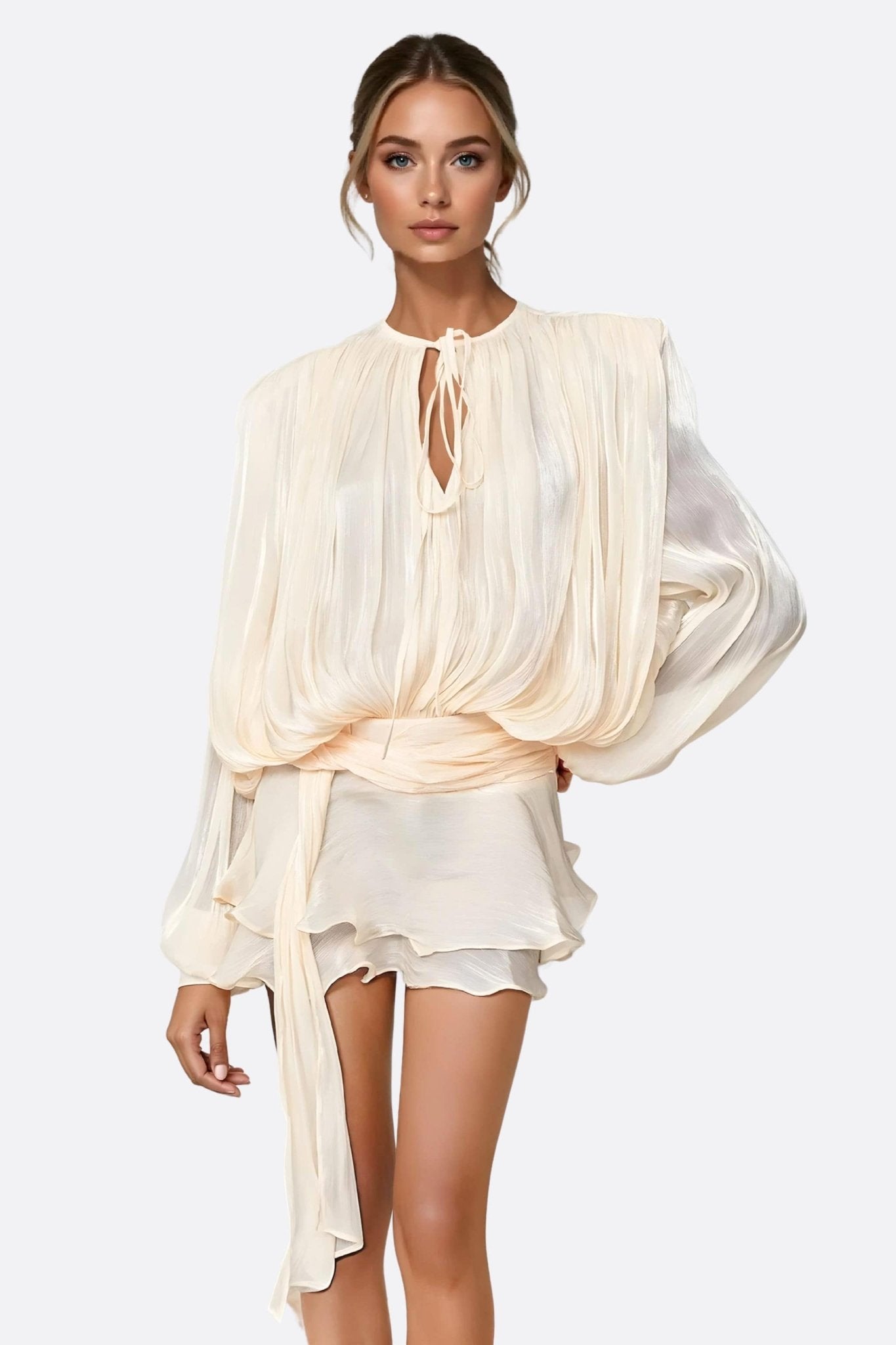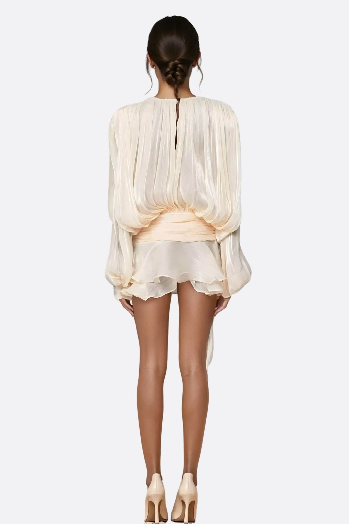 A modern romantic piece designed to turn heads, the blush pink draped ruffle mini dress blends lightness, movement, and feminine detailing. Crafted from a soft, lightweight fabric with a subtle sheen, it flows effortlessly with every step. The blouson long sleeves and split tie-neckline frame the upper body with elegance, while the softly draped waist sculpts and flatters the silhouette. Finished with a layered ruffle hem, this dress strikes the perfect balance between playful charm and refined sophistication.