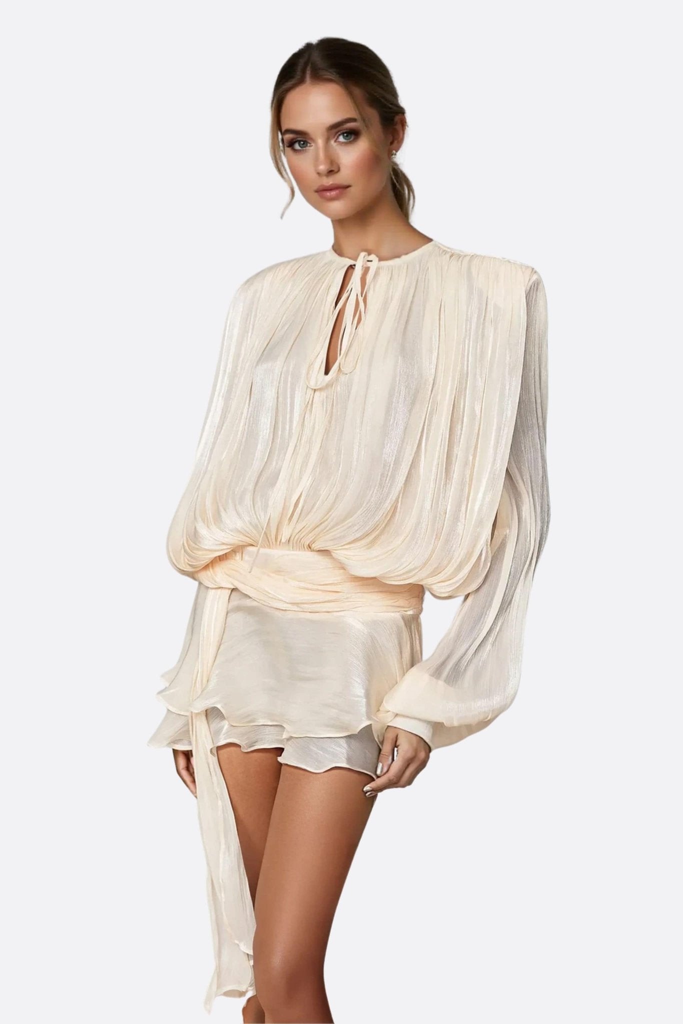 Sleeves: Long, airy blouson sleeves for subtle volume