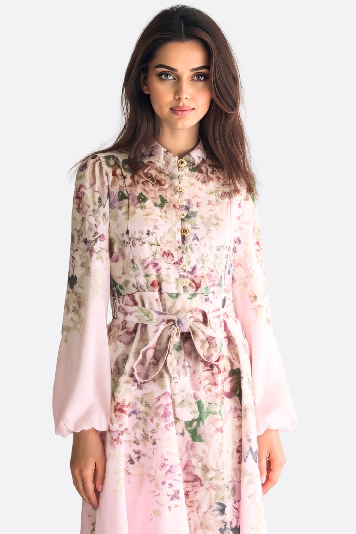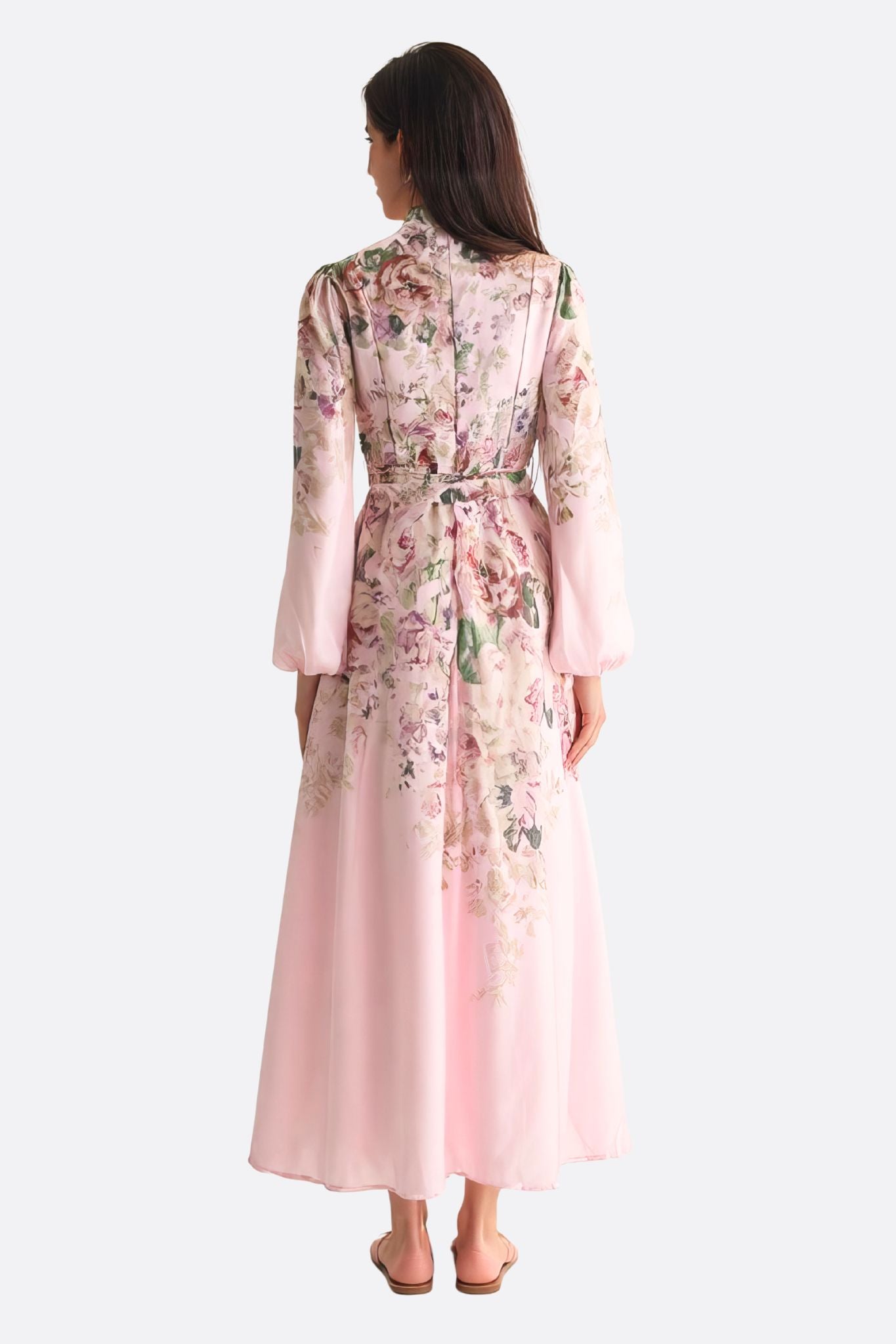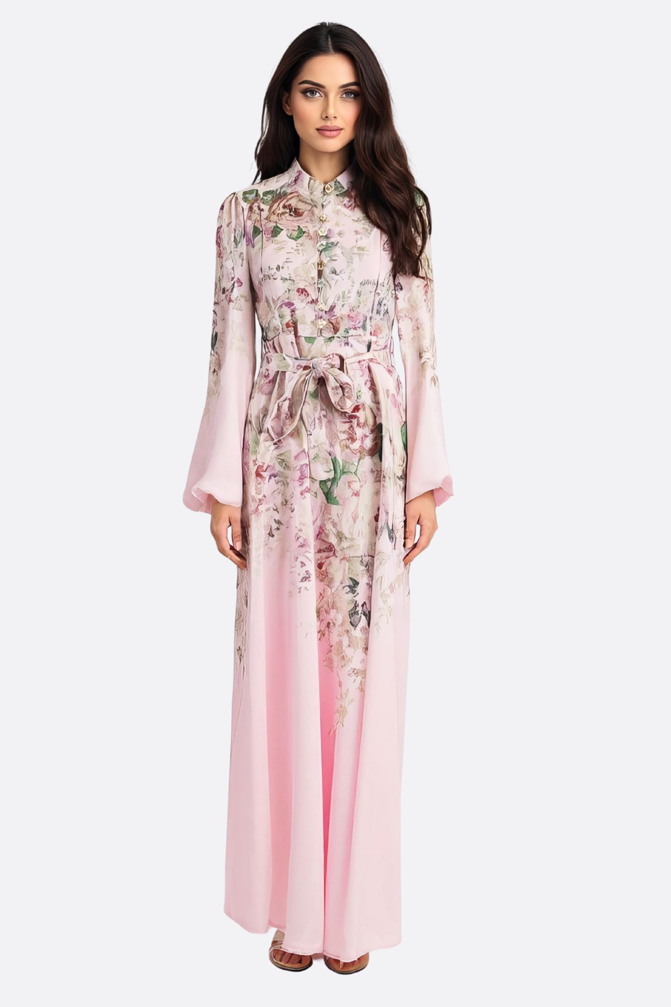 Pink Floral Maxi Dress with Jewel Buttons & Belt